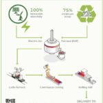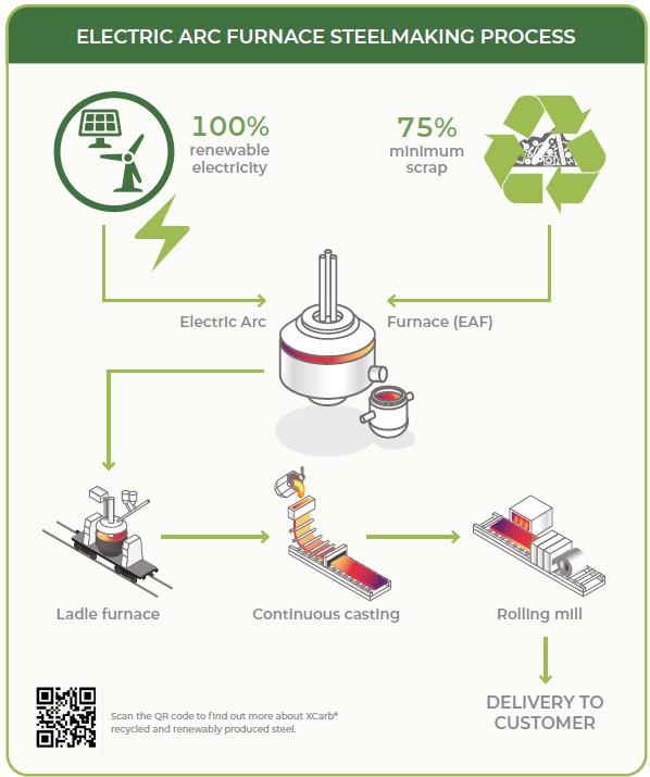 - All the electricity comes from renewable sources (assured via ‘Guarantee of origin’) and the steel is manufactured using very high levels of scrap steel.